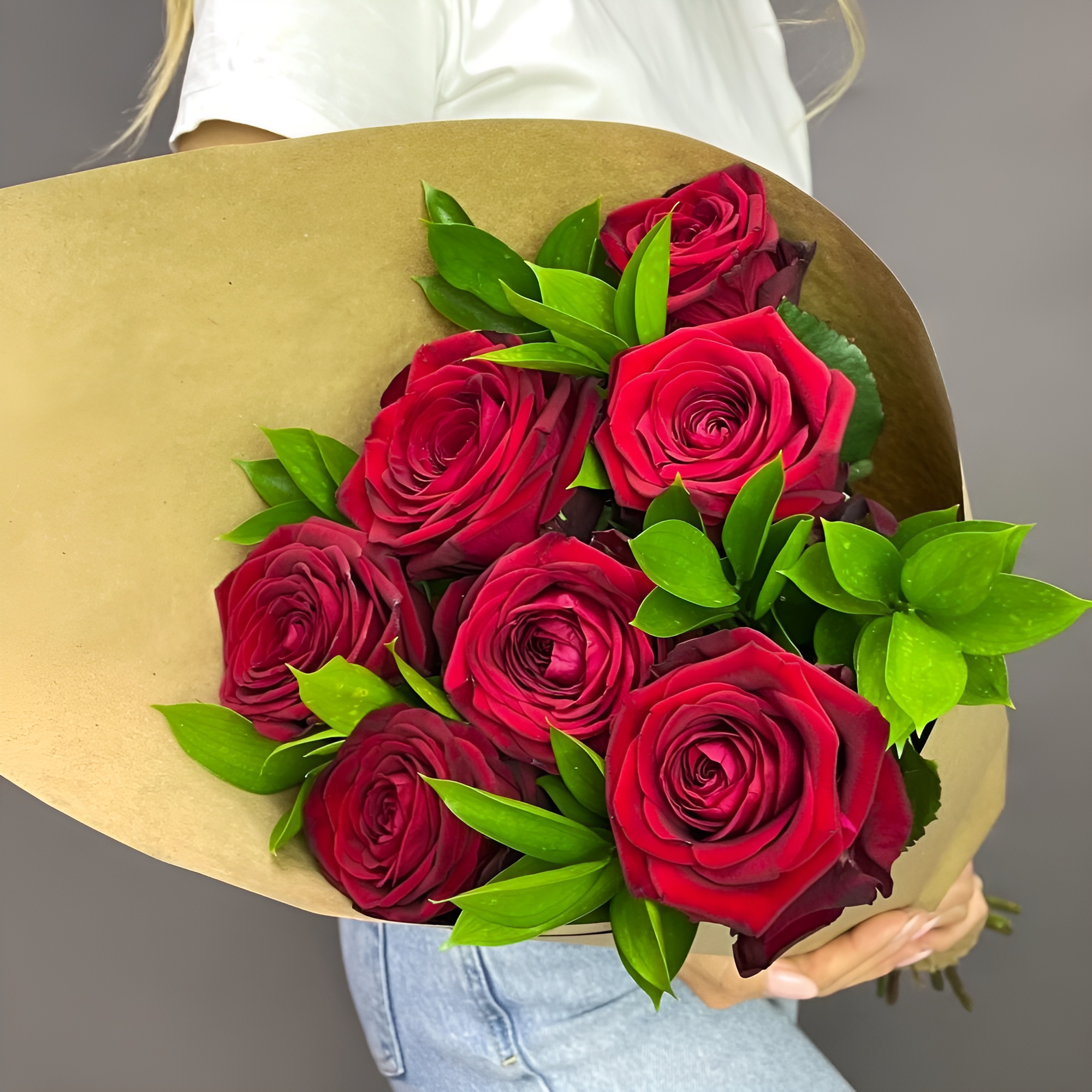 Букет из красных роз с рускусом в крафтовой упаковке – классика с изюминкой