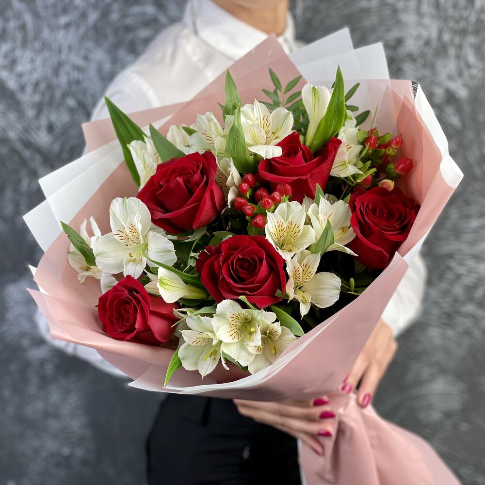 Элегантная композиция из 5 красных эквадорских роз и 4 белых альстромерий с добавлением фисташковой зелени и гиперикума. Изысканный подарок для особых моментов. Заказ цветов с доставкой на дом Анадырь.