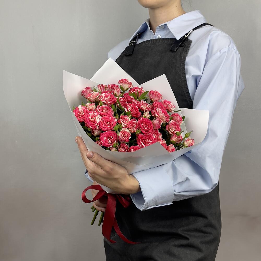 Яркая композиция из 9 кустовых роз «Фейерверк» с переливами розовых и белых оттенков.
