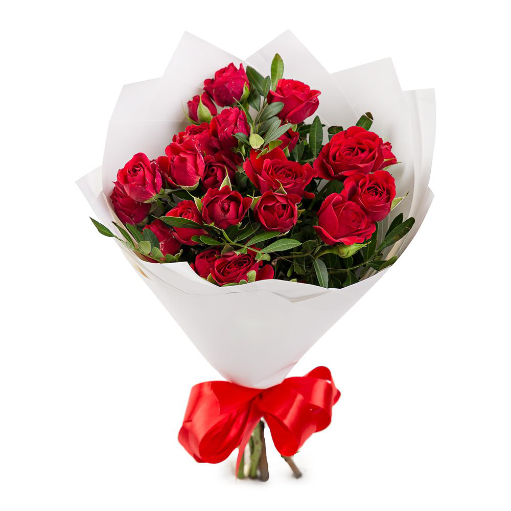 Утонченная композиция из 5 красных кустовых роз с фисташковой зеленью — воплощение страсти и свежести. Идеальный выбор для романтического подарка. Доставка роз Анадырь от Афло.