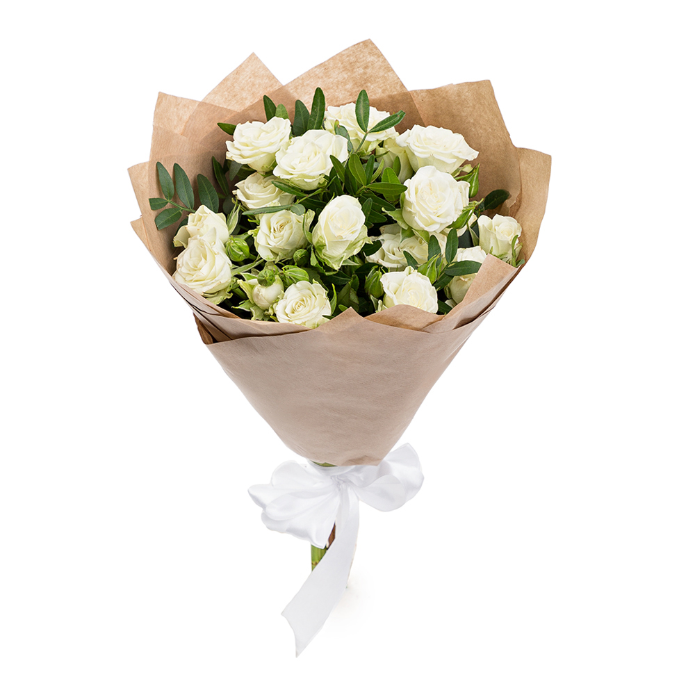 Нежная композиция из 5 белоснежных кустовых роз с фисташковой зеленью — воплощение чистоты и свежести.