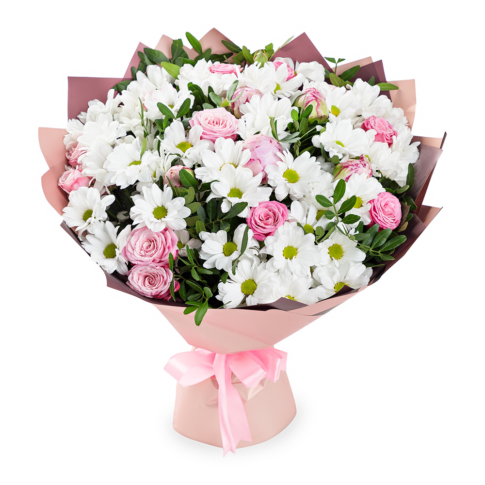 Изысканный букет сочетает нежно-розовые розы и пышную белую хризантему, создавая гармонию романтики и чистоты. Эта свежая композиция идеально подходит для признания в чувствах или особого поздравления. Купить букет цветов в Анадыре.