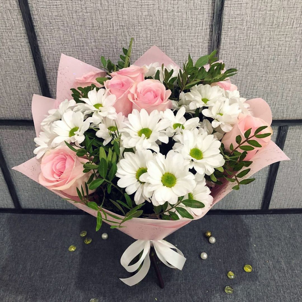 Изысканная композиция из нежных розовых роз и белоснежных хризантем — символ гармонии и чистоты чувств.