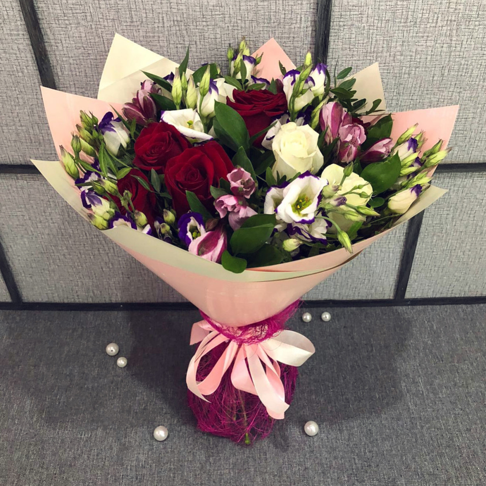 Изысканная композиция из роз, эустом и альстромерий – идеальное сочетание нежности и долговечности. Прекрасный выбор для романтических моментов и торжеств. Заказать букет цветов с доставкой в Анадыре.