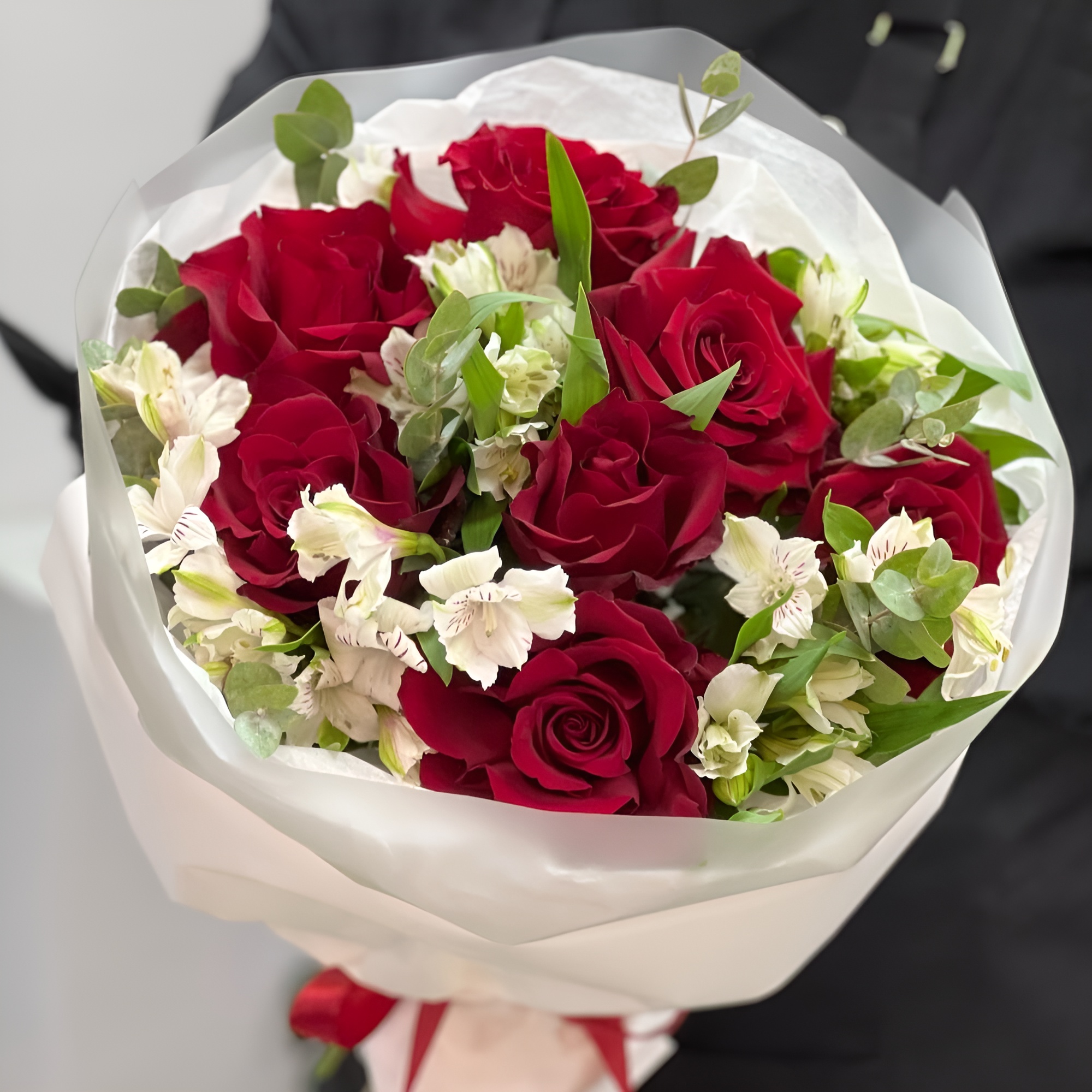Букет «Любимой» – 7 эквадорских роз и белых альстромерий