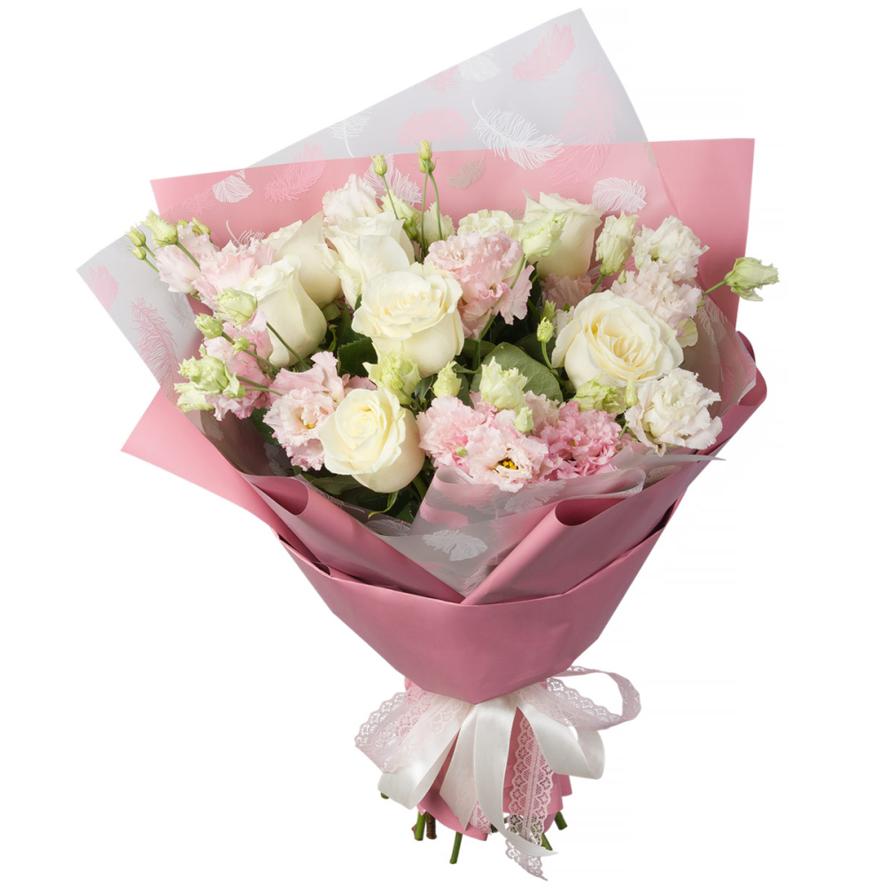 Трогательный букет «Объятия любимой» сочетает хрупкие розовые эустомы и благородные белые розы. Идеальный романтический подарок для особых моментов. Букет цветов с доставкой Анадырь.