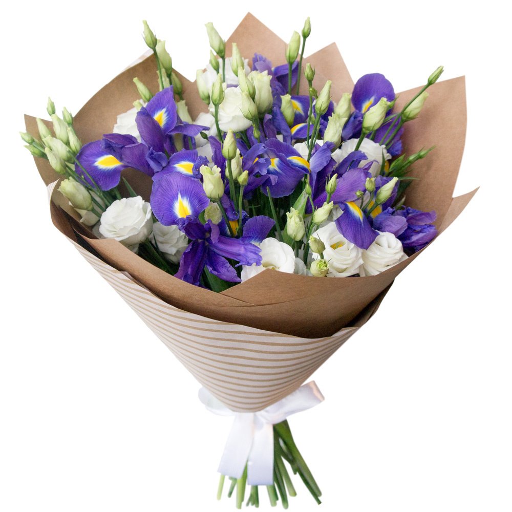 Утонченная композиция из свежих синих ирисов и нежных белых эустом – воплощение элегантности и чистоты. Идеальный выбор для особых моментов. Цветы с доставкой Анадырь.