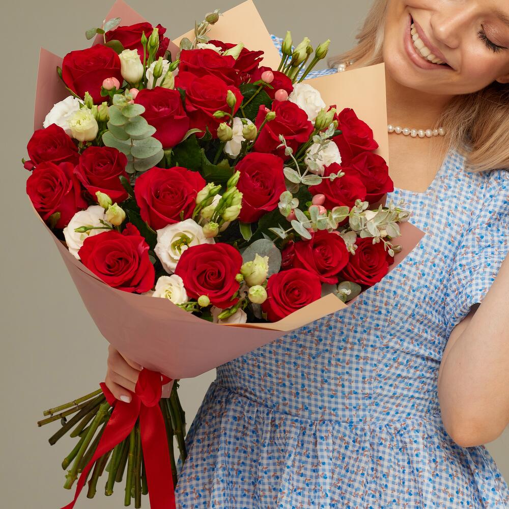 Изысканная композиция из 21 красной розы, 5 эустом и зелени — воплощение страсти и нежности. Идеальный выбор для признания в любви. Букет цветов с доставкой Анадырь.