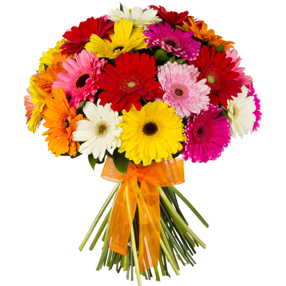 Яркий букет «Мамба» — это смелая комбинация оранжевых, лиловых, желтых и розовых гербер.