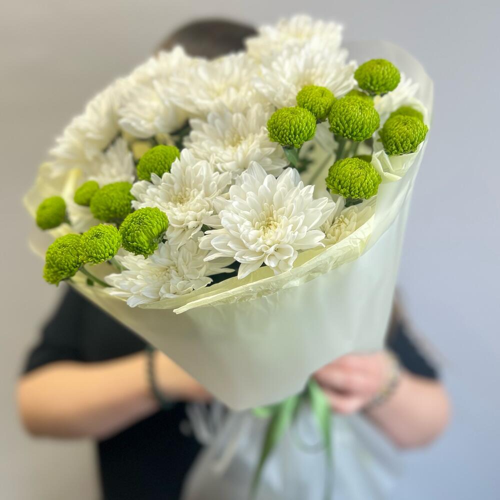 Уникальная композиция из белоснежных кустовых хризантем и редких зеленых «Филин Грин» — воплощение свежести и элегантности.