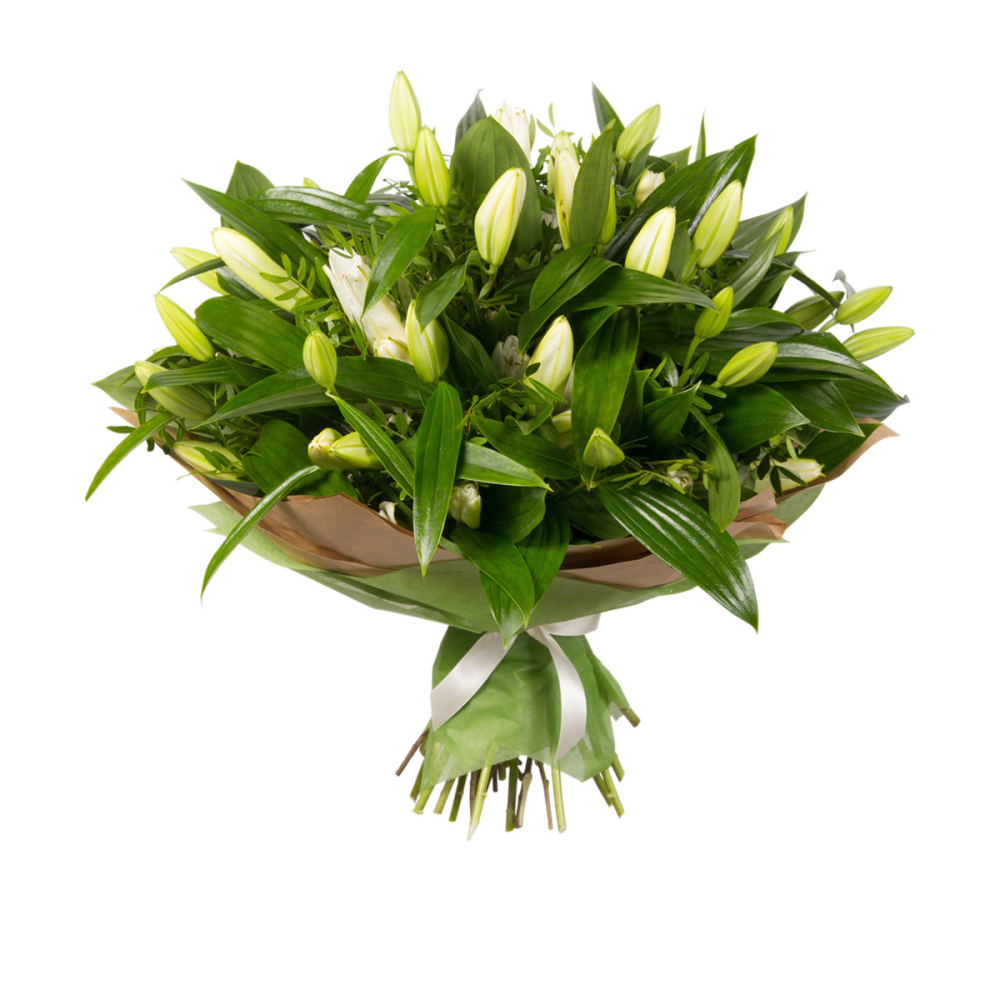 Утонченный букет из белых лилий с нежной фисташковой зеленью — воплощение свежести и изысканности.